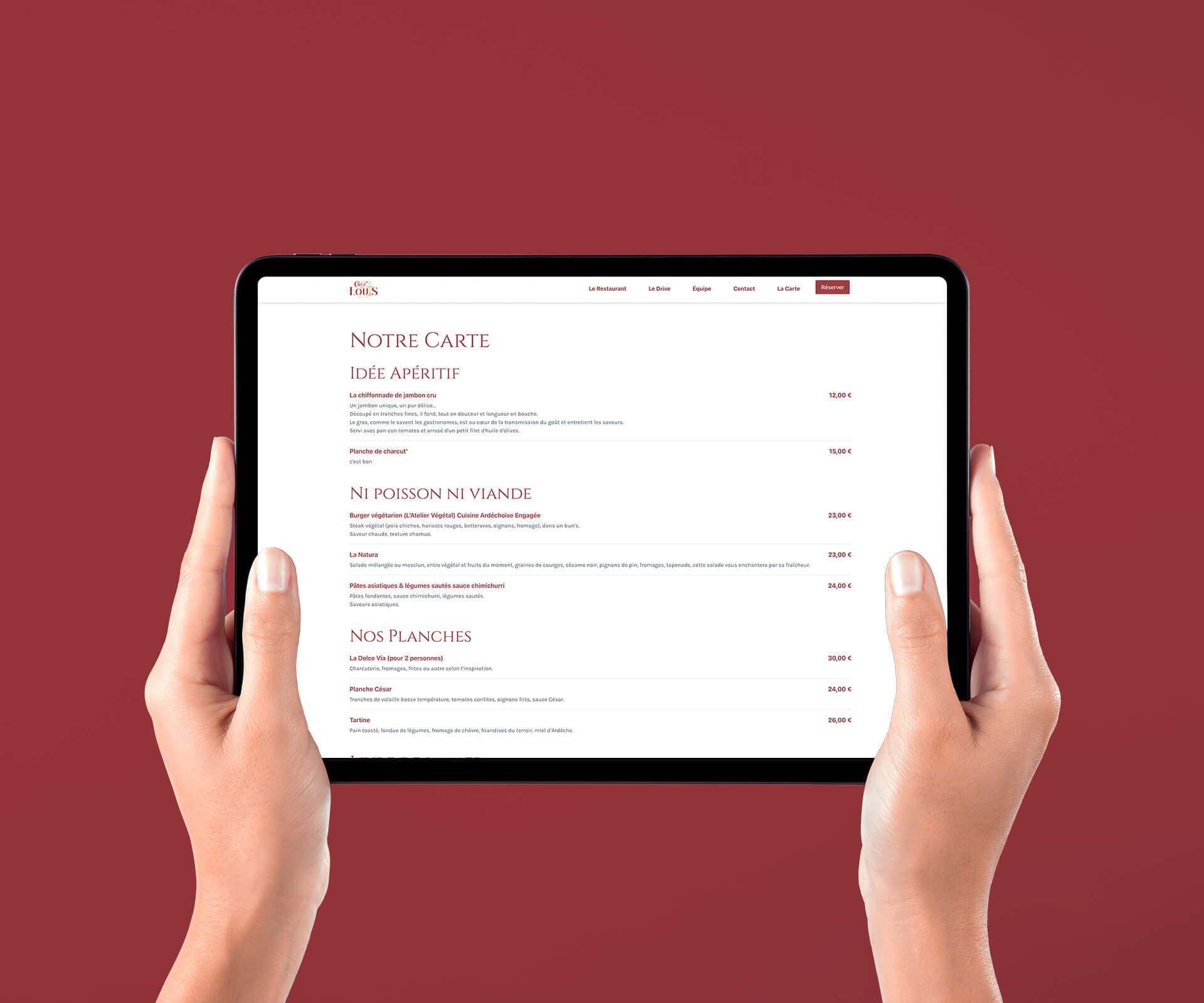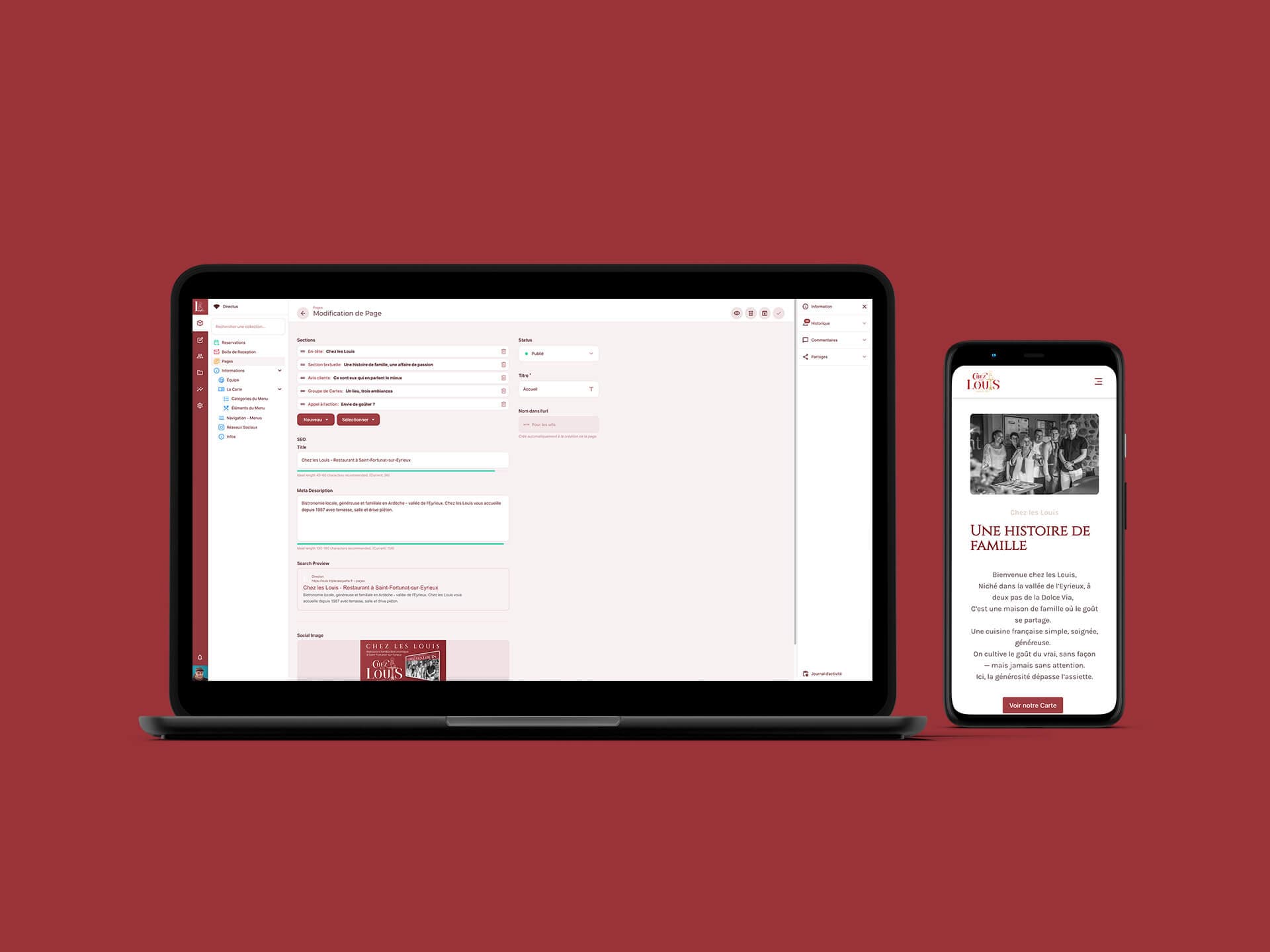 Le site comprend une page d’accueil globale, une présentation du restaurant, du concept de drive, de l’équipe, des cartes et menus, ainsi qu’une page contact. L’ensemble est entièrement responsive et facile à gérer via Directus, assurant ainsi une autonomie complète à la famille Louis.